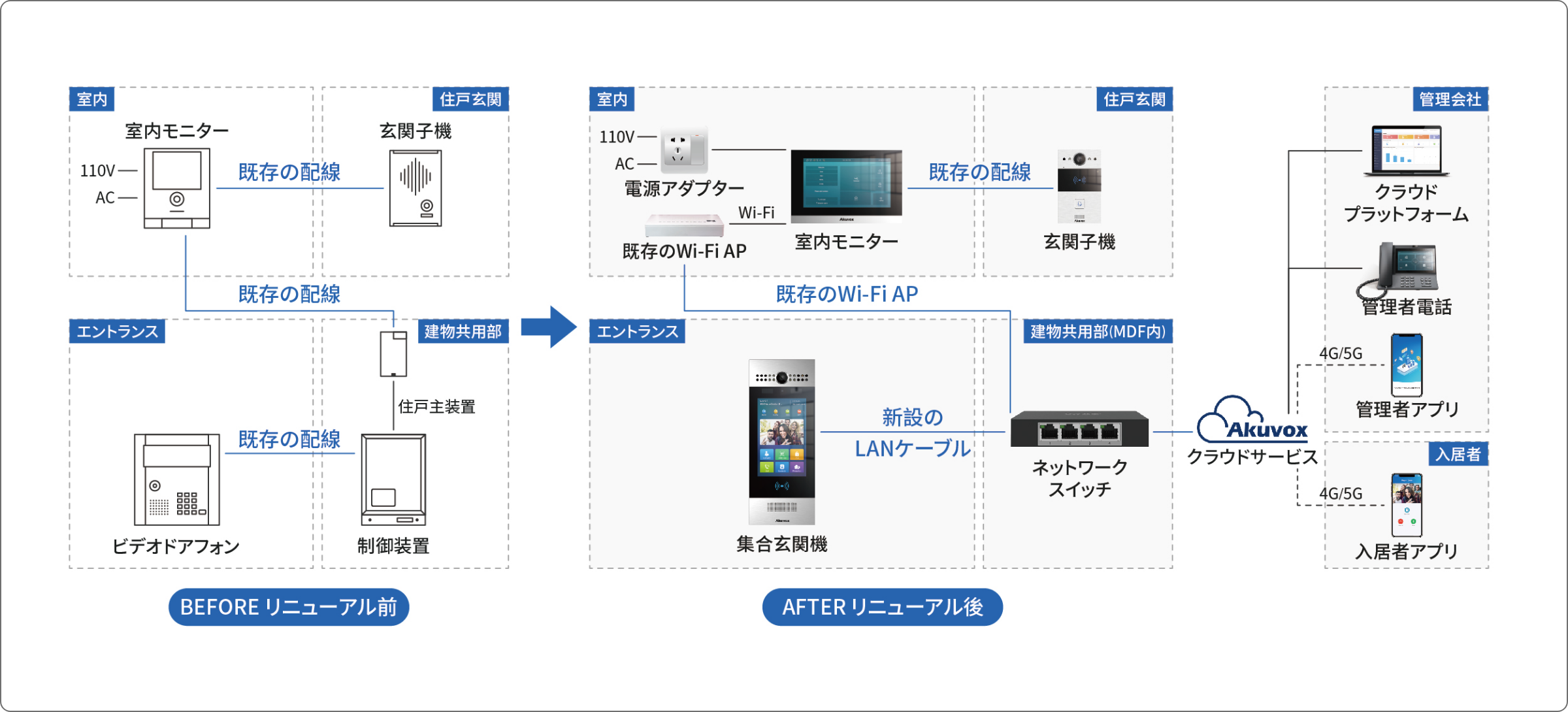 Akuvoxの集合住宅向けインターフォンソリューションなら、既存配線を活用した短工期リニューアルが可能。