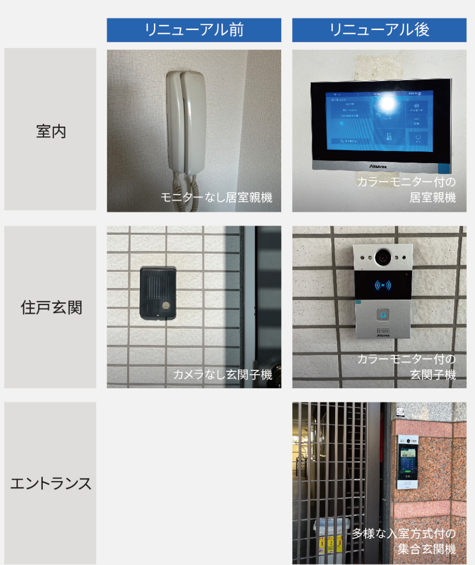 室内モニターや集合玄関機の更新により、外観・機能ともに物件価値が向上しました。