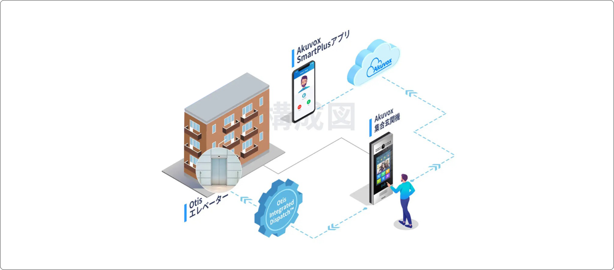 Akuvoxスマートインターフォンと日本オーチス製エレベーターを連携させ、集合玄関の解錠と同時にエレベーターを自動呼び出し。