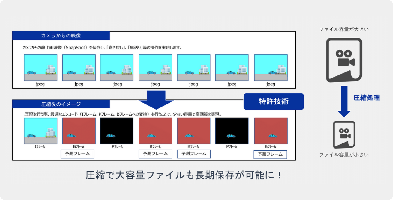 特許技術による高効率圧縮で、高精細な映像を長期間保存。過去の作業内容や施工工程をいつでも確認でき、品質改善やクレーム対応にも役立ちます。