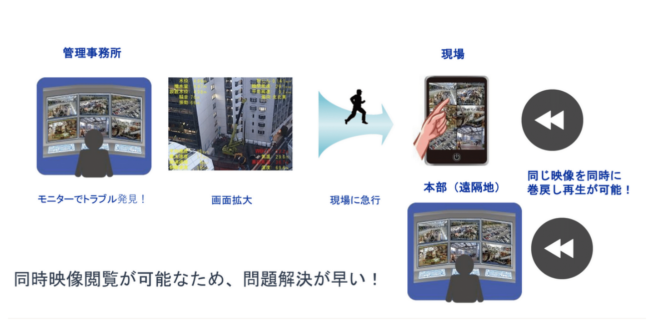 現場と事務所・本部が同じ映像を同時に閲覧可能。トラブル発生時の判断や対応スピードが向上します。